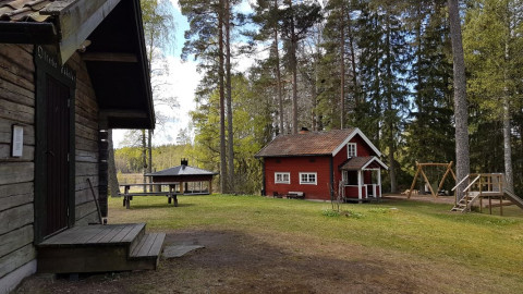 Den röda stugan kan bokas och omfattar storstuga med öppen spis och sovloft med fyra bäddar och sängkläder (medtag egna lakan eller sovsäck). El finns. Kylskåp, spis, ugn, mikro samt husgeråd finns i stugan.